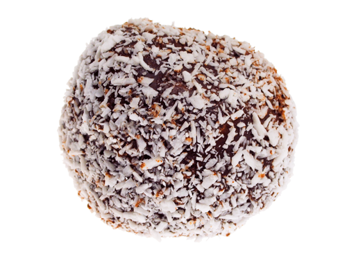 Vores romkugle m. kokos er lavet med kagemasse, kakao, romessence & kokos